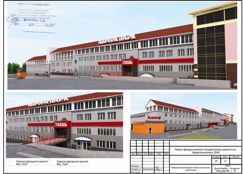 Мы разработали эскизный проект на капитальный ремонт фасада Бизнес центр «Аврора парк» и Торгового центра «Гвоздь», расположенного по адресу: УР, г. Ижевск, ул. Удмуртская 304 в Индустриальном районе. Наша команда в составе архитектора и технолога, совместно с конструктором, предложили несколько вариантов внешнего облика будущего здания и планировок в соответствии с пожеланиями заказчика. По прошествии, нескольких рабочих совещаний получилось создать объект, который украсит и город и будет соответствовать пожеланию заказчика. В дальнейшем эскизный проект согласовали с Главным управлением архитектуры и градостроительства администрации города Ижевска.