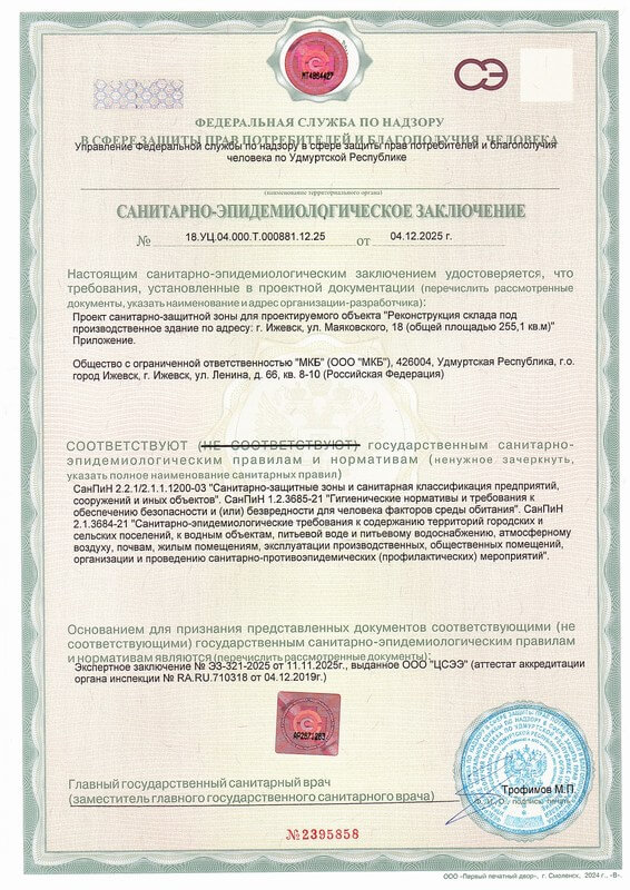 Получено санитарно-эпидемиологические заключения на соответствие государственным санитарно-эпидемиологическим правилам и нормативам от Управления Федеральной службы по надзору в сфере защиты прав потребителей и благополучия человека по Удмуртской Республике (Управление Роспотребнадзора по Удмуртской Республике) на проектную документацию, разработанную специалистами ООО «Архитектурная мастерская Шайхутдинова и Ко».