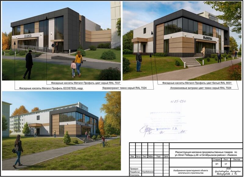 Мы разработали эскизный проект на реконструкцию магазина, расположенного по адресу: УР, г. Ижевск, ул. 30 лет Победы, 46 в Октябрьском районе. Наша команда в составе архитектора и конструктора, предложили несколько вариантов будущего здания и планировок в соответствии с пожеланиями заказчика. В дальнейшем эскизный проект согласовали с Главным управлением архитектуры и градостроительства администрации города Ижевска.